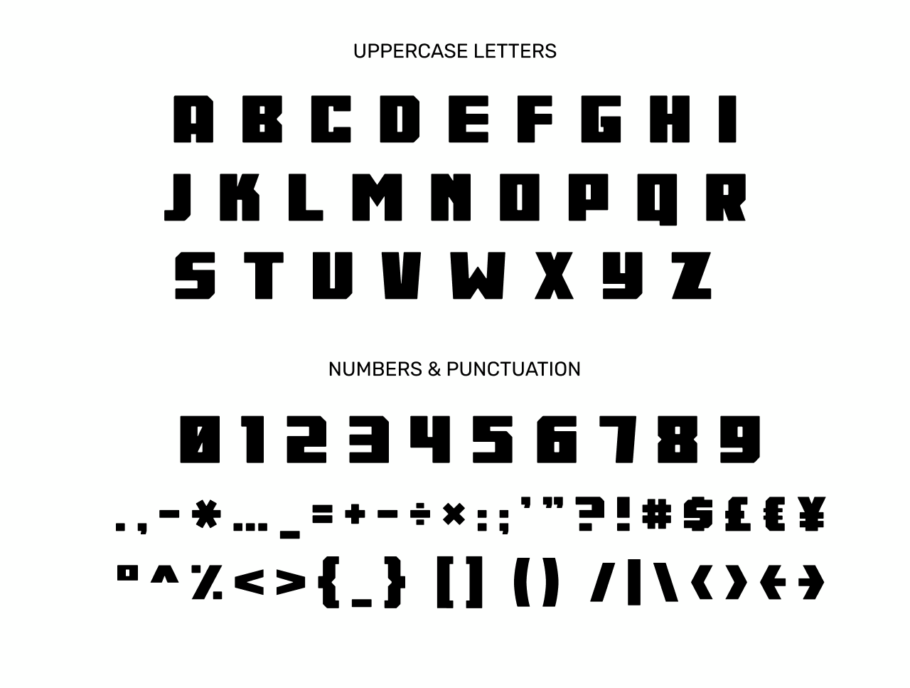 CyberPanic! is a display typeface with a futuristic, blocky, cyberpunk aesthetic.